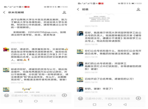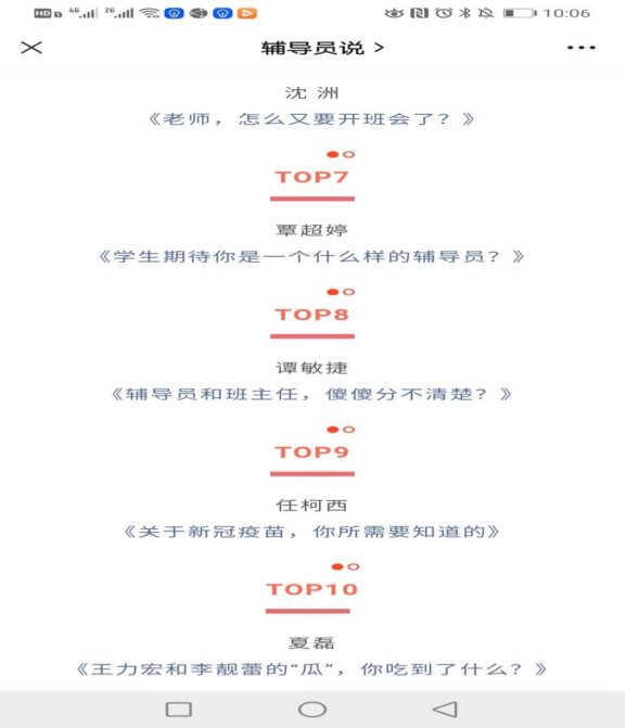 平台建设以来,撰写原创网文共8.3万字,推送网络思政文章总阅读量达 160000+,公众号在全省范围内初具影响力,后台收到省内外辅导员和大学生一致好评。原创网文被“中国大学生在线”、“辅导员说”、“高校辅导员工作室”、“高校辅导员在线”等全国知名网络思政平台全文多次转载。原创网文——《辅导员和班主任傻傻分不清楚?》获“辅导员说”微信公众号 2021 年度十大人气作品。