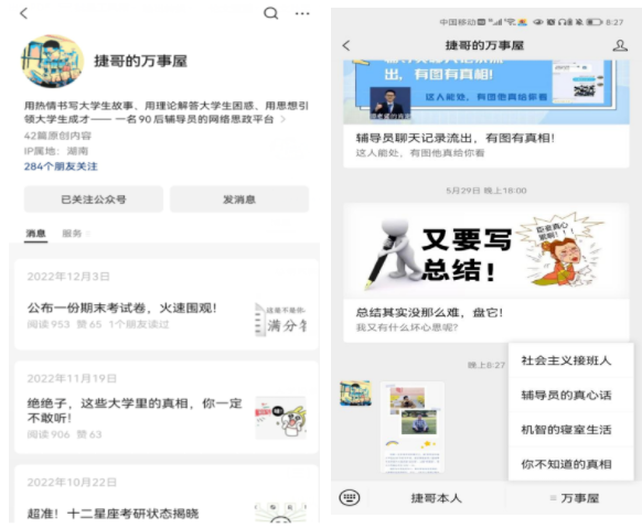 为提升思政教育的亲和力、针对性、时代感和吸引力,谭敏捷老师于2020年探索建设了“捷哥的万事屋”微信公众平台,坚持以朴实话语与微观叙事为方法,探索思政教育话语转型路径;以大学生思维习惯与接受特征为依据,遵循思想政治工作规律和学生成长规律;以大学生日常学习生活为素材,聚焦大学生思想问题与实际问题;以微信公众号和中国大学生在线为主阵地,形成全方位育人的纵横矩阵;以辅导员个人品牌和网红IP为推手,提升网络思政的亲和力与认同感。