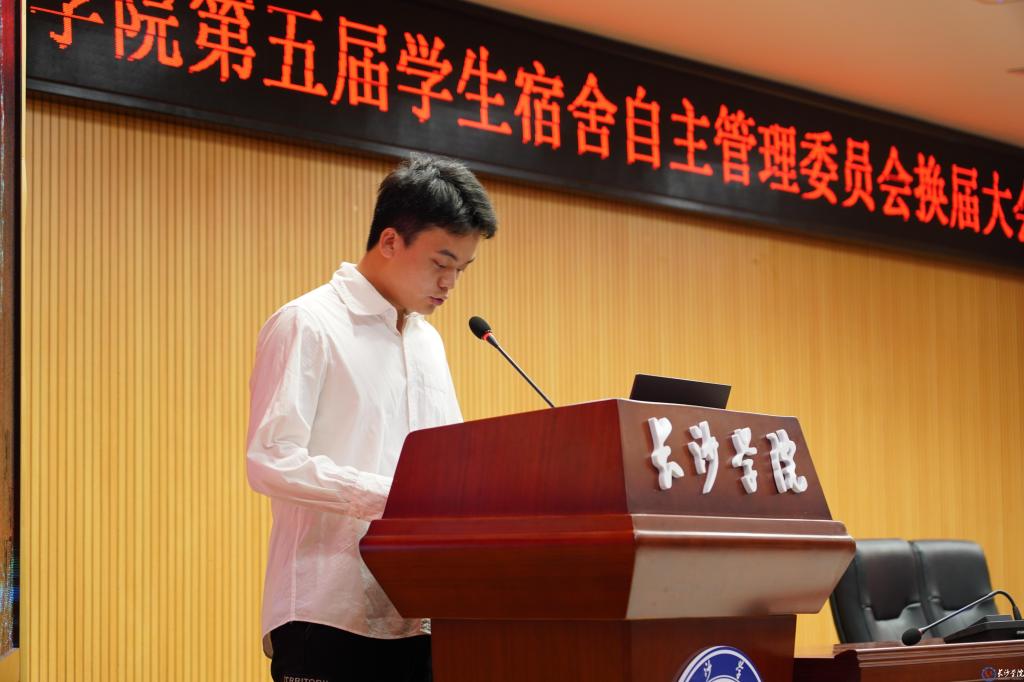 2023年6月13日下午6点,长沙学院第五届学生宿舍自主管理委员会换届大会于图书馆一楼学术报告厅成功举行。学工处宿管中心主任喻磊老师、宋颖老师,电信学院宿舍专干谢力老师、机电学院宿舍专干柳佳柱老师出席本次会议,第四届学生宿舍自主管理委员会全体成员、各楼栋栋长、各二级学院分会会长及各学院寝室长代表参加本次会议。会议由第四届自委会会长舒炳竣主持。