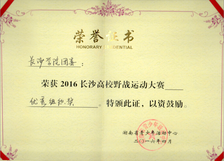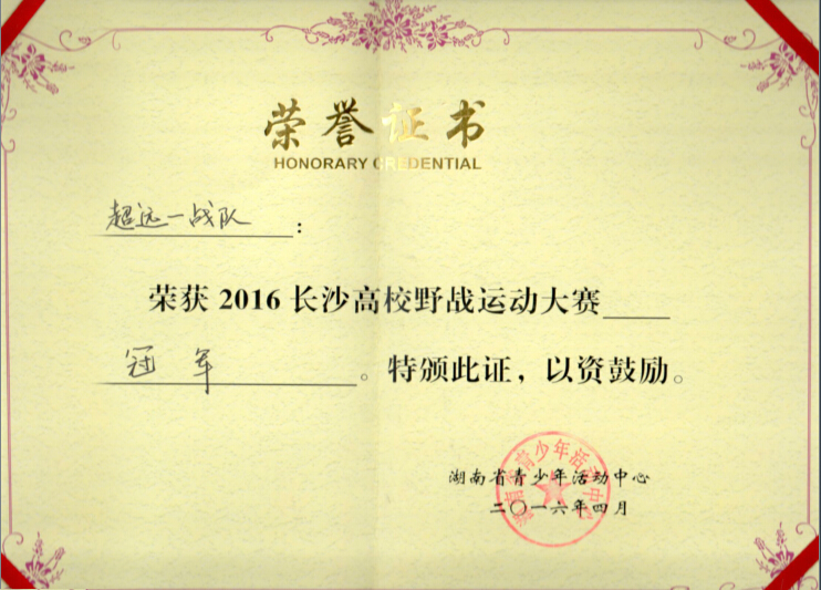 为庆祝“五四”青年节的到来,4月23日湖南省青少年活动中心主办的“2016长沙高校野战运动大赛”在长沙市岳麓区王家湾第九区野战俱乐部举行。活动旨在培育广大青少年爱国主义精神,引导和帮助青少年加强体育锻炼、培养拼搏精神。本次大赛参赛队伍均由长沙地区高校学生组建,包含国防科大、湖南司法警官职业学院等共16支队伍,近百余名大学生参加。大赛采取5人制团体对抗赛形式,通过分组赛、淘汰赛决出冠亚季军。经过紧张激烈的角逐,我校国旗班超远一队夺取冠军,国旗班超远二队获得亚军,我校团委荣获“优秀组织奖”。