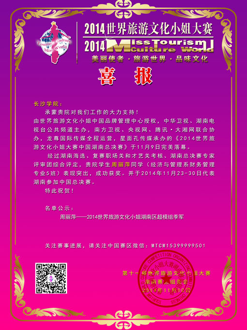 我校团委选送的2012级经济与管理系财务管理5班的周丽萍同学在总决赛中顺利通过“潇湘智慧秀、潇湘才艺秀、十强女神辩论赛、潇湘晚礼秀”等五个环节激烈竞争,最终以靓丽的外形、敏锐的才智从3000多名选手中脱颖而出,荣获超模组季军,并将代表湖南参加于11月底举行的全国总决赛。