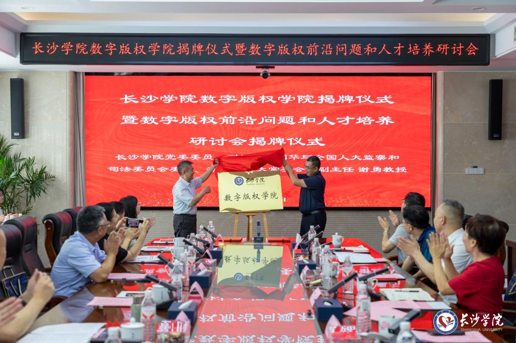 6月7日,长沙学院数字版权学院挂牌仪式暨数字版权前沿问题和人才培养论证会在长盛楼4001会议室举行,标志着全国高校首家数字版权学院正式成立。全国人大监察和司法委员会委员、湖南省人大常委会原副主任谢勇教授,湖南省高级人民法院原副院长、湖南省法学会学术委员会主任杨翔教授,湘潭大学知识产权学院院长肖冬梅教授,长沙市知识产权局局长侯向宇出席揭牌仪式。我校党委委员、副校长何利华宣读了学校成立数字版权学院的决定,并与谢勇教授共同为“长沙学院数字版权学院”揭牌。活动由党委委员、纪委书记丁文主持。