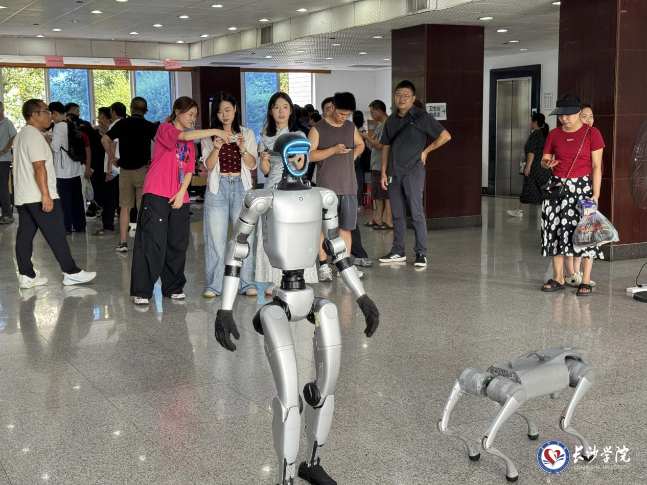 迎新现场,各二级学院纷纷亮出“特色招牌”,以创意十足的迎新方式为新生及家长带来别样体验。生物与化学工程学院将廉洁与心理元素融入迎新大礼包,助力新生扣好大学第一粒扣子;艺术设计学院和土木工程学院将学生优秀设计作品搬到了迎新现场,计算机科学与工程学院派出了机器人和机器狗,让新生对未来的专业学习有了更直观的感受;经济与管理学院的迎新点主打“科技感”,新生和家长戴上VR体验设备,即可通过虚拟场景“云游”张家界,生动展示了学院在数字人文与虚拟旅游领域的扎实探索与优秀成果。