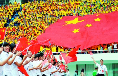 看台上的3万余名大中学生,全都身着国旗颜色的衣服。3万余面大大小小的国旗,握在他们每个人手中,伴着一首首红歌有力的节奏挥舞飘动,密密盛开在贺龙体育中心。鲜红、橙黄,点热全场,此时此地,"国旗"成为最贴切的形容词。